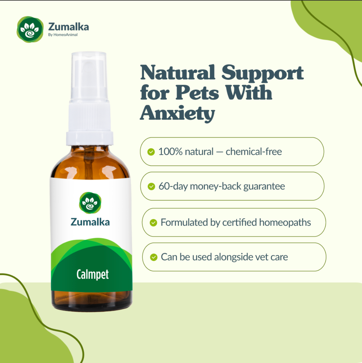 The CALMPET natural remedy helps maintain the balance of the nervous system and improve the social behavior of your pet. The different natural homeopathic ingredients work in synergy to promote an overall sense of serene well-being. CALMPET works in cases of tremors, fear, nervousness, hypersensitivity to noises, apprehension and so much more! Your pet is on the way to a better nervous system and emotional health with this EXCELLENT and easy-to-administer spray!