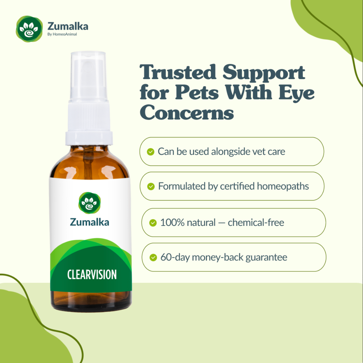 CLEAR VISION has gentle and effective ingredients that make it the IDEAL solution for your pet’s eye health! This high-quality homeopathic formula supports your pet's lenses by working against blurred vision, dull eye pain, eye damage due to age and even watery eyes! We know that vision impairment is never something any pet-parent wants to deal with. This is why CLEAR VISION is the ideal product to support your pet’s eye health to keep you (and everything else) clear in their view!